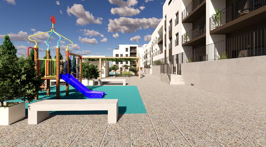 Una urbanización moderna con zonas comunes espaciosas, espacios ajardinados y juegos infantiles donde la piscina ocupa un lugar protagonista con una pérgola que ofrece grandes posibilidades para disfrutar al aire libre, generando diferentes ambientes.
