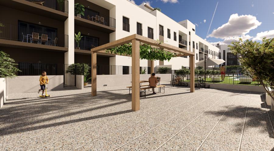 Como en todas nuestras promociones, Terral2 Sant Joan tiene una gran piscina con espacio para el relax. La zona comunitaria cuenta además con una bonita pérgola para encuentros y esparcimiento, aparca bicicletas y amplios espacios para los más pequeños.